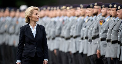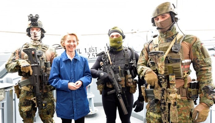 Ursula’s mandate was to expand and increase readiness of the Bundeswehr, and she set about the job with gusto. She began a constant drumbeat for war, arguing that the German army was too small and unprepared to face whatever new enemy she conjured up on that day. Be it Afghanistan, Iran, China, Russia or Syria, Ursula consistently advocated for more weapons, more war, and more money. Ursula even proposed a German foreign legion to bolster the ranks of the Bundeswehr, a proposal that was met with horror and condemnation from all sides.
